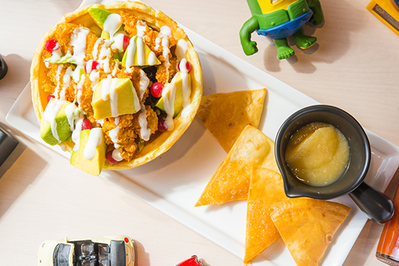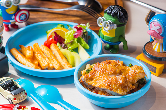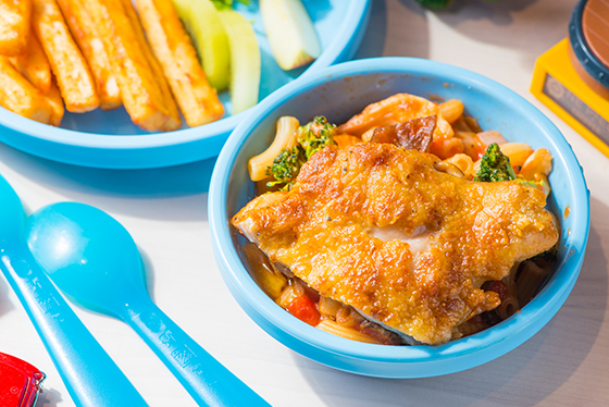 酸甜的番茄滋味讓孩子大口咬下雞肉,底下是俏皮好入口的通心麵,一旁還有薯條、沙拉和果汁,完整的配餐,豐富配色增添食慾。.jpg)